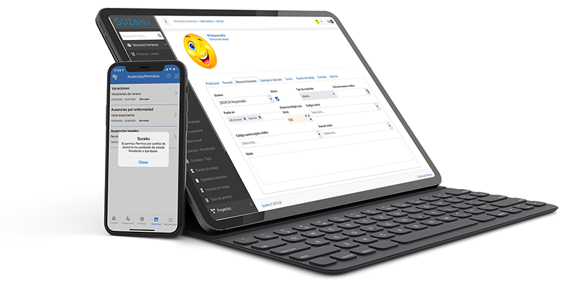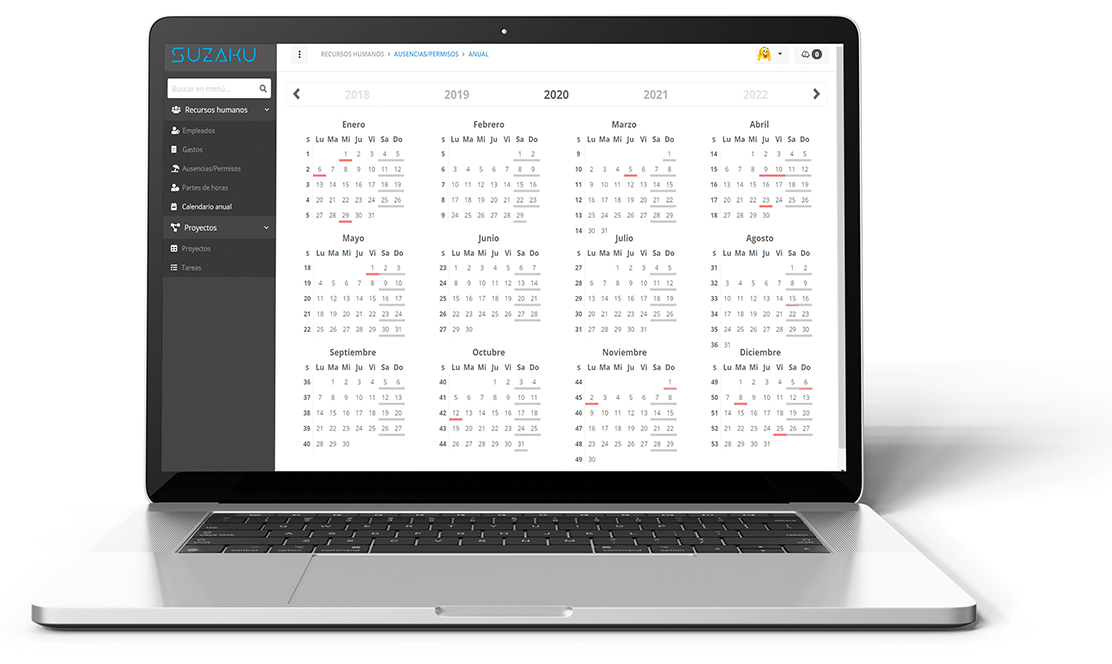 Completa gestión de vacaciones y ausencias mediante workflow de solicitud y aprobación desde la aplicación web o desde la app móvil. Cálculo de días de vacaciones anuales y saldo disponible en tiempo visible para administrador y empleado. Potente visor gráfico en formato calendario donde ver el estado de la plantilla de empleados